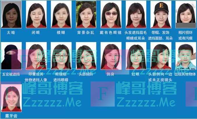 2、证件照是出现问题最多的,主要包括:a. 照片过于模糊、b. 面部阴影过重或明暗差异过大、c. 着领口较大或吊带衫的照片、d. 头部被切割、e. 侧脸侧身照、f. 双耳或额头被头发遮挡、g. 戴眼镜有反光或导致面部变形。下面是一些错误示例: