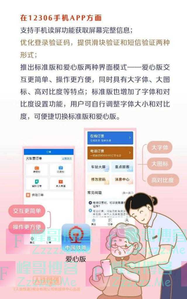 在12306手机APP方面,支持手机读屏功能获取屏幕完整信息;优化登录验证码,提供滑块验证和短信验证两种形式;推出标准版和爱心版两种界面模式,爱心版交互更简单、操作更方便,同时具有大字体、大图标、高对比度等特点,标准版也增加了字体和对比度设置功能,用户可自行调整字体大小和对比度,可便捷切换标准版和爱心版。