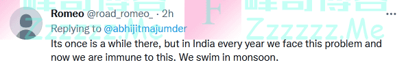 “它只是在那里发生了一段时间,但在印度,我们每年都面临这个问题,现在我们对这个问题已经免疫了。我们在雨季时游泳。”