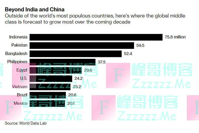 中产阶级人数增加较快的其他国家也在亚洲,例如印度尼西亚,在2030年时,印尼的中产阶级人数将位居全球第四,超过俄罗斯、日本;而孟加拉国人口稠密,中产阶级人数增加也很快,预计将从第28名升至第11名,增加逾5000万人。