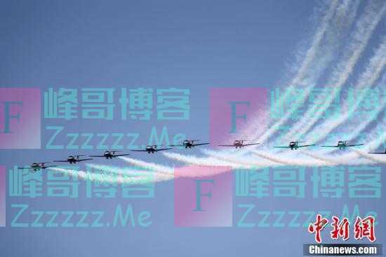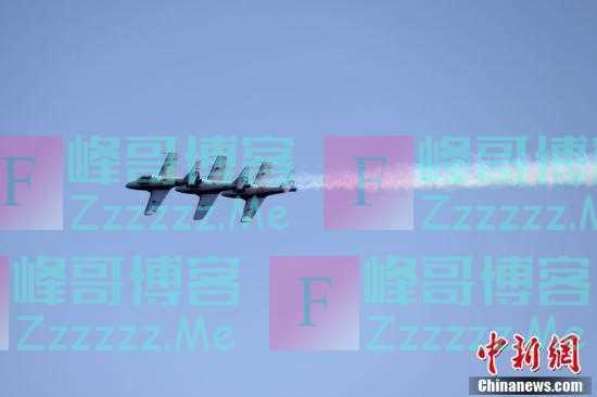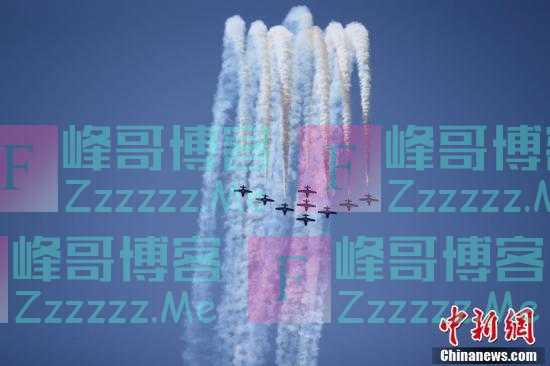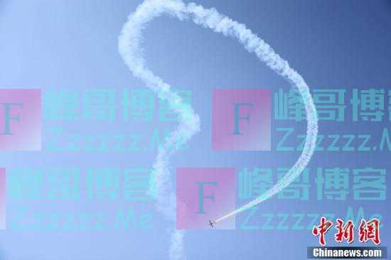 一架飞机在多伦多举行的2021年加拿大国际航展上进行飞行表演时展现空中“作画”。