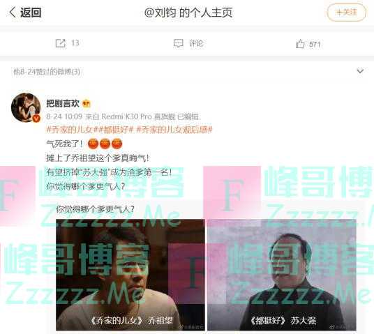 网友们调侃乔祖望这个角色是“苏大强”二号,刘钧也在微博点赞了《乔祖望和苏大强,哪个爹更气人》的议题投票,对于“乔父”这个人物的理解,他对浙江卫视直言:乔祖望这个父亲比苏大强更加惹人生气。虽然都是不讨喜的角色,但是网友在声讨之余也对乔祖望这个角色有着自己独特的视角解读,“觉着这个爹很气人,但是心不坏”,这种理性看待演员与角色之间关系的理解,是对演员演绎的认可。“四个月的时间浓缩了这样一个人的大半生,还是蛮有感触的。尤其是拍完了以后,很长时间我都很挺难以忘怀。”刘钧说道。