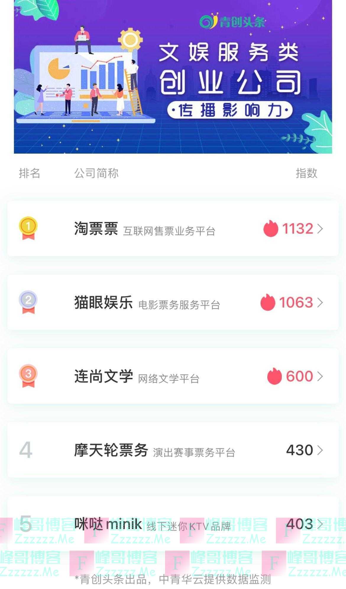 根据青创头条发布的2021年7月文娱服务类创业公司传播影响力TOP5中,淘票票、猫眼娱乐、连尚文学、摩天轮票务、咪哒minik进入前五。