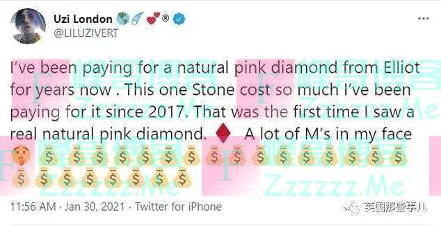 1月31日,乌兹发推特庆祝自己终于买下了这颗10-11克拉的粉钻: