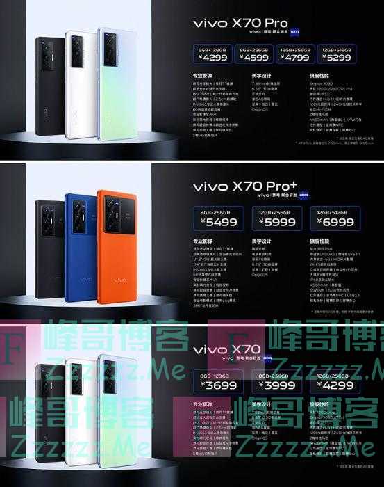 此次vivo X70系列带来五款配色,其中vivo X70 Pro+拥有至黑、旅程和旷野三款配色,vivo X70/X70 Pro则带来至黑、独白和星云三款配色。价格方面,vivo X70 Pro 8GB+128G版、8GB+256GB版、12GB+256GB版和12GB+512GB版本价格分别为4299元、4599元、4799元以及5299元;vivo X70 Pro+ 8GB+256GB版、12GB+256GB版和12GB+512GB版本售价分别为5499元、5999元以及6999元;vivo X70售价3699元起。vivo X70 Pro及vivo X70 Pro+于9月17日正式开售,X70于9月30日正式开售。