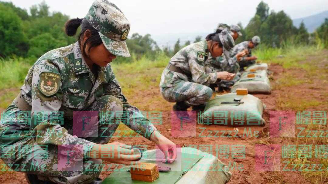 为了练习扫雷操作时的稳定性,这些不服输的女兵们把弹壳放在探雷器上,还在休息时候集体加练“举砖头”。