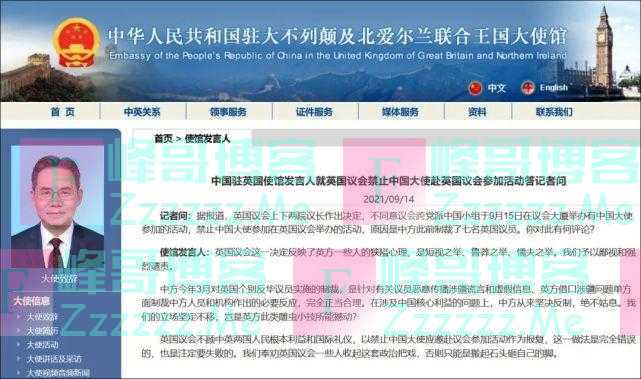 英国议会禁止中国大使进入,中国驻英国使馆发言人回应》发布于2021-9-16