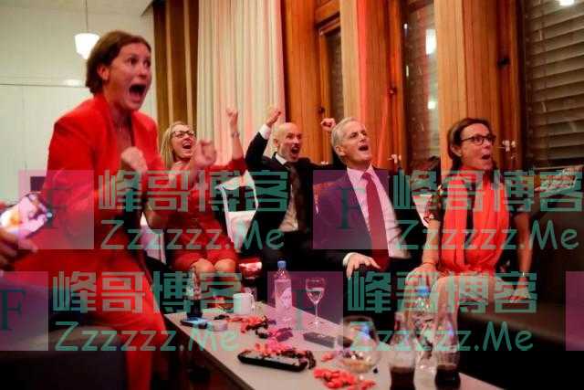 9月13日,挪威工党领袖斯特勒(右二)和竞选团队收看选举投票结果后欢呼。(图自视觉中国)