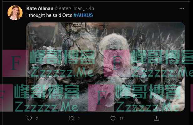 “AUKUS”公布后,其浓重的“盎格鲁-萨克逊”味道,在国际舆论中引起嘲讽。有澳大利亚女记者发推称,“AUKUS”拼错了,应该是“Orcs”(与“AUKUS”同音,是《指环王》中邪恶凶残的“兽人族”)。