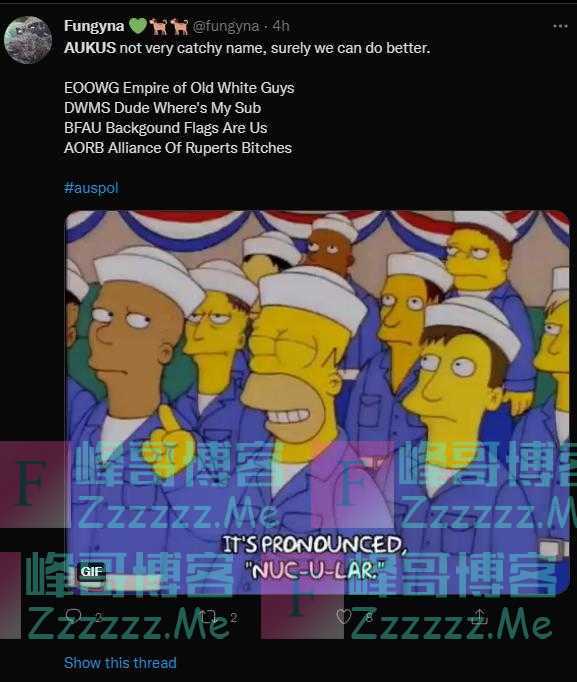 还有网友表示,“AUKUS”不确切,应该叫“EOOWG”(Empire of Old White Guys 老白男帝国)”,或者“AOE”(Axis of evil 三国邪恶轴心),或者“AORB”(Alliance of Ruperts Bi**hes,默多克姘头联盟,讽刺三国都被默多克控制)。