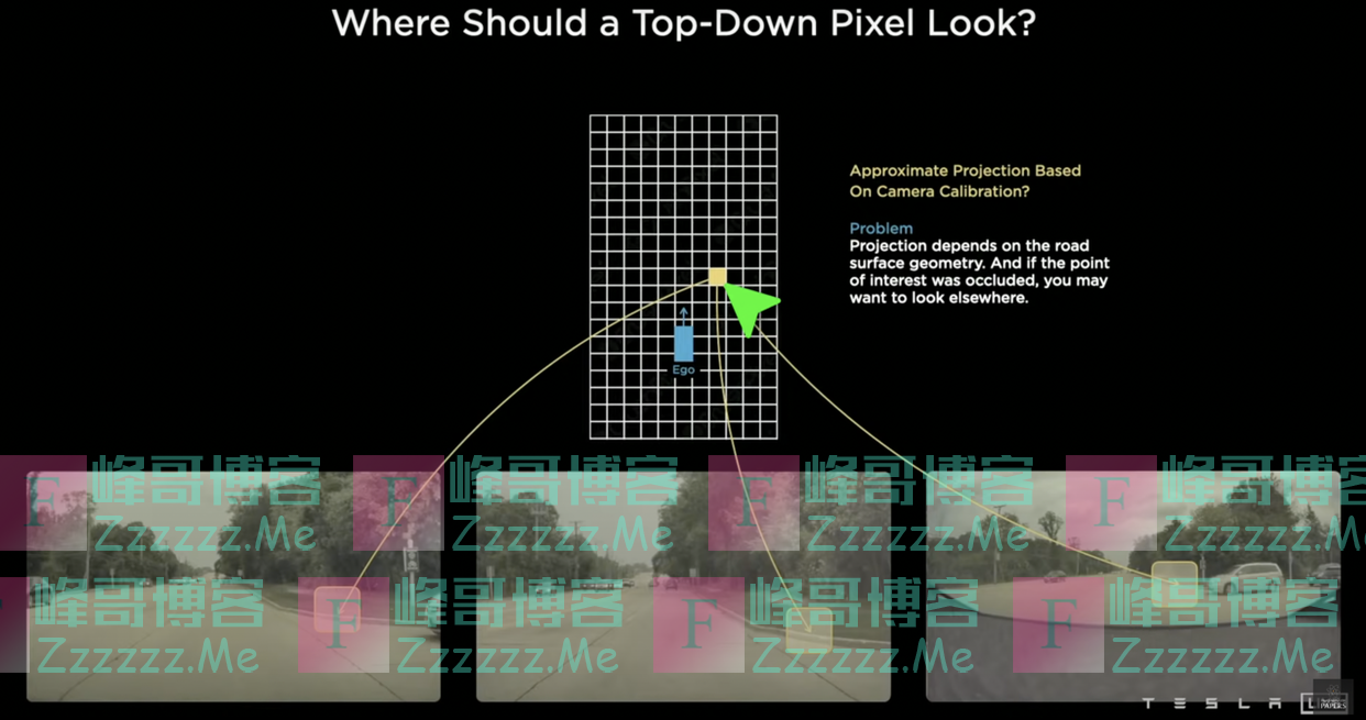 首先的一个难点是,不同视角的摄像头都只能看到周边环境的一部分,有不同的校准(calibration)、位置(location)、取景方向(view direction)等,比如以下这张图,谁能知道这个点对应于相机视图的哪个点?而我们只有知道这些信息,才能把周围物体准确放到向量空间视图(vector space view)中。
