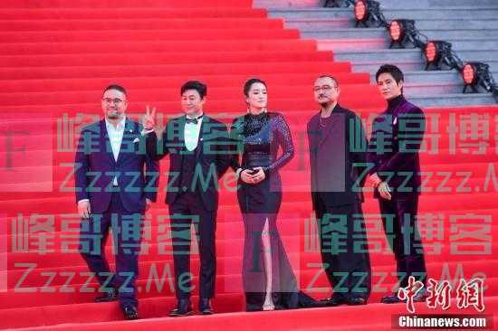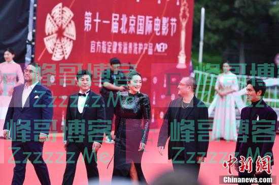 第十一届北京国际电影节“天坛奖”评委主席巩俐(中),评委陈坤(右一) 、乌尔善(右二)、张颂文(左二)、陈正道(左一)亮相开幕红毯。