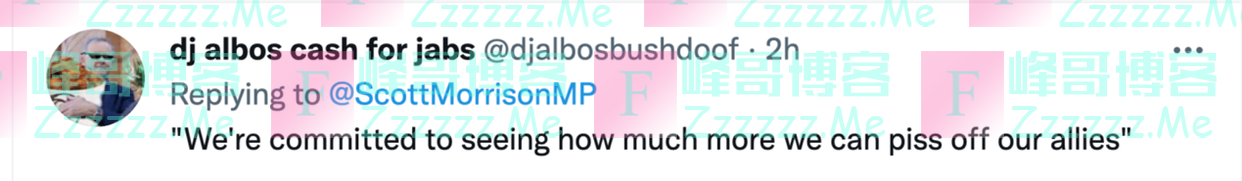 还有人联系起了美澳日前对法国的所作所为,模仿拜登和莫里森的口吻说:“我们致力于看看能把我们盟友气到什么程度。”