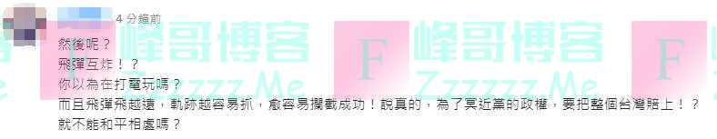 更有网友留言质问:“然后呢?导弹互炸!?你以为在打电玩吗?而且导弹飞越远,轨迹越容易抓,愈容易拦截成功!说真的,为了冥近党的‘政权’,要把整个台湾赔上!?就不能和平相处吗?”