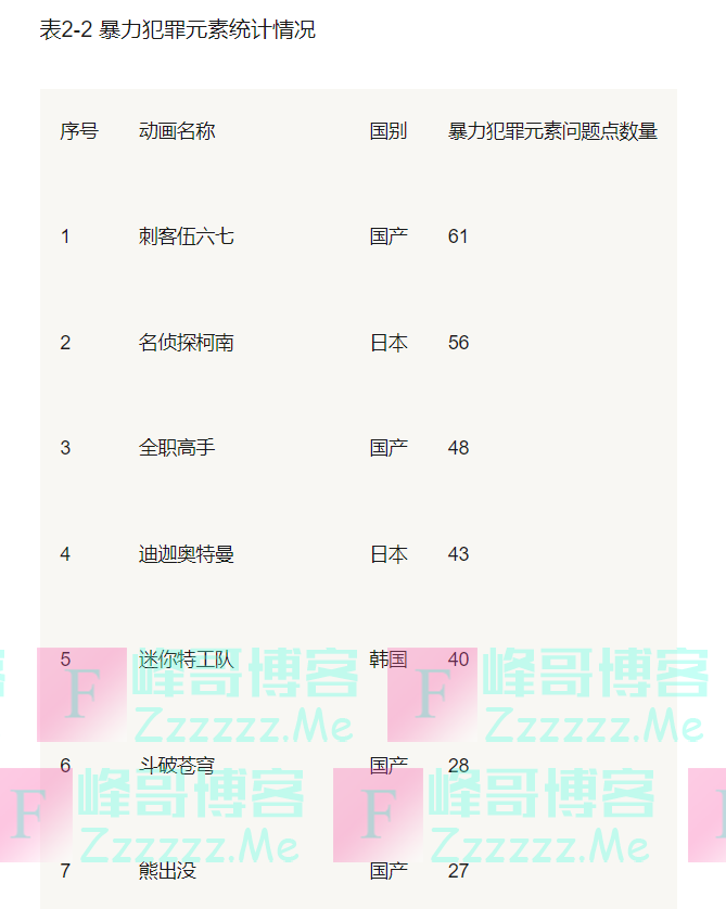 其中,点名的动画片有:《迪迦奥特曼》中除奥特曼日常打怪兽情节外,还涉及到持械殴打、多人恐吓、纵火爆炸等暴力情节;《熊出没》中,光头强人物总是手持猎枪或者电锯出现;《芭比》中存在人物埋炸药、偷窃、抢劫等犯罪元素:《斗破苍穹》、《名侦探柯南》、《刺客伍六七》、《从零开始的异世界生活》、《魔道祖师》作品中均不同程度存在见血、肢解等血腥场面,需引起高度重视。