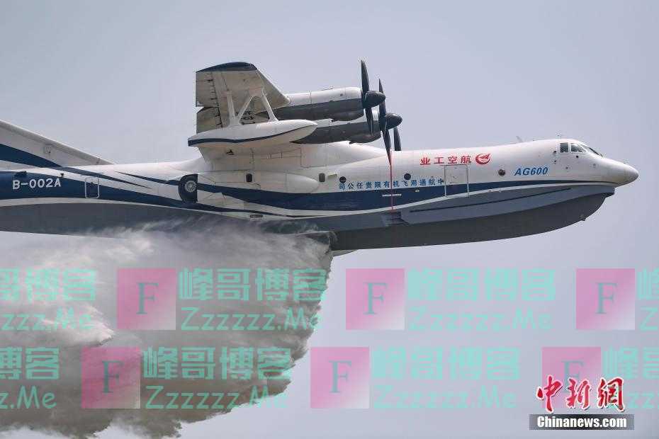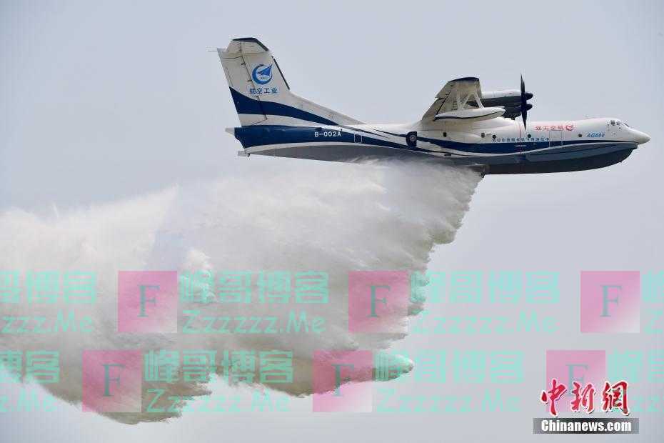 9月28日,广东省珠海市,大型灭火/水上救援水陆两栖飞机“鲲龙”AG600进行飞行投水功能演示。当日,第十三届中国航展在珠海国际航展中心开幕。 中新社记者 陈骥旻 摄