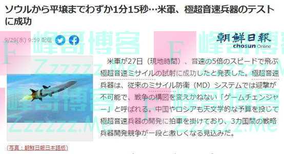 “美军成功测试高超音速武器,从首尔打到平壤仅要1分15秒……”韩国《朝鲜日报》29日用大标题猛夸美军的成就,并赤裸裸地威胁朝鲜。但没过多久,它就尴尬地发现,朝鲜也试射了同样高超音速的武器……那么,从平壤打到首尔需要多长时间?到底是谁在威胁谁?