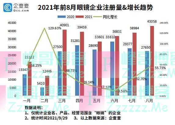 企查查数据显示,2021年前8个月,我国新增26.64万家眼镜相关企业。其中,3月新增眼镜相关企业40.90万家。最近的8月新增眼镜相关企业43.06万家,同比增长55.73%。