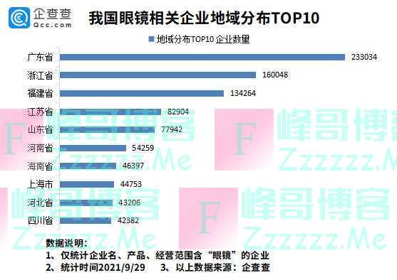 企查查数据显示,从地域分布来看,我国新增眼镜相关企业最多的省份是广东省,共新增23.30万家。第二、三名分别是浙江省、福建省,新增企业16.00万家、13.43万家。其次是江苏省、山东省、河南省等。