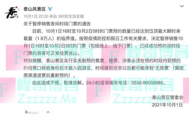 据@泰山风景区 1日晚间消息,目前,10月1日16时至10月2日5时的门票预约数量已经达到岱顶最大瞬时承载量(1.9万人)的临界值。