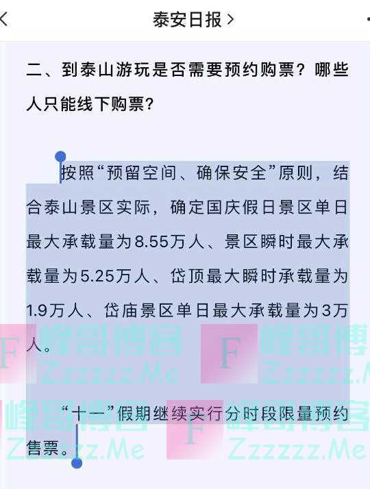 在十一黄金周前,泰安日报发布旅游注意事项,按照“预留空间、确保安全”原则,结合泰山景区实际,确定国庆假日景区单日最大承载量为8.55万人、景区瞬时最大承载量为5.25万人、岱顶最大瞬时承载量为1.9万人、岱庙景区单日最大承载量为3万人。