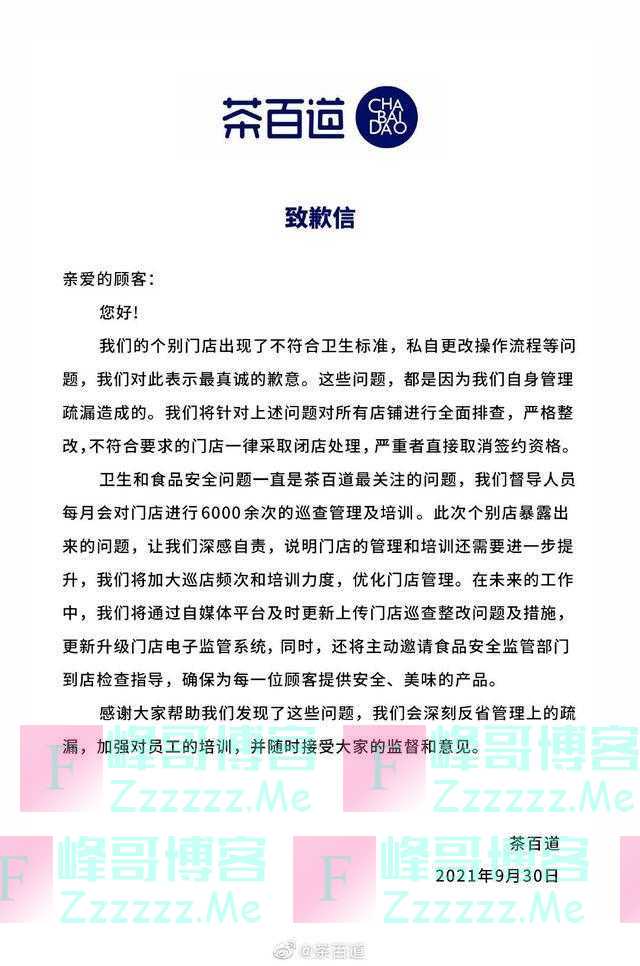 茶百道在致歉信中称,个别门店出现了不符合卫生标准,私自更改操作流程等问题,对此表示歉意。将针对所有店铺进行全面排查并整改,不符合要求的门店一律采取闭店处理,严重者直接取消签约资格。