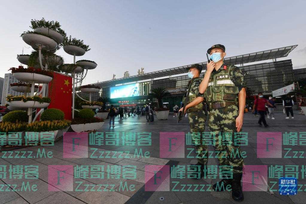本文转自【新华网】; 10月1日,武警上海总队执勤第三支队某中队官兵在上海火车站重点区域警戒。 新华社发(刘威 摄)