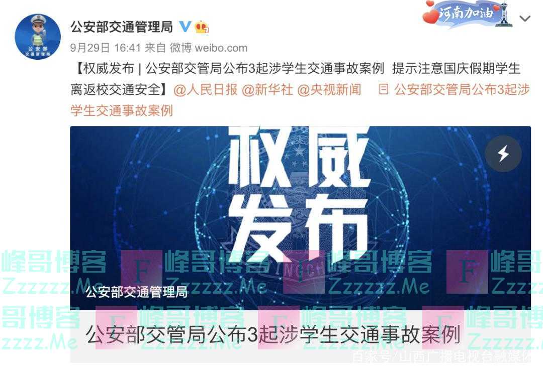 公安部交管局9月29日消息,9月份,公安部交通管理局接报3起涉及学生集中离返校的交通事故。