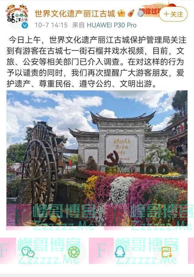 有关部门也关注了此事,10月7日下午两点左右,世界文化遗产丽江古城保护管理局发布微博表示:已关注到有游客在古城七一街石榴井戏水视频,目前,文旅、公安等相关部门已介入调查。在对这样的行为予以谴责的同时,我们再次提醒广大游客朋友,爱护遗产、尊重民俗、遵守公约、文明出游。