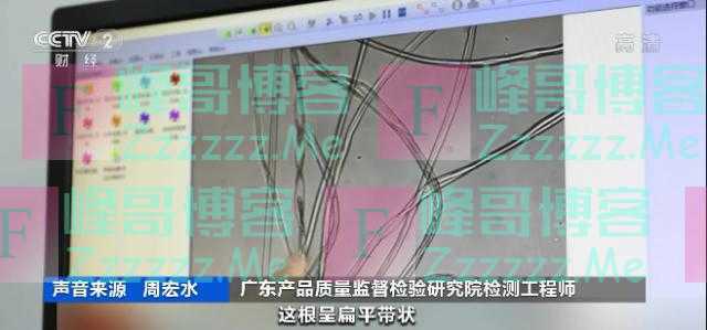 广东产品质量监督检验研究院检测工程师 周宏水:从屏幕中我们可以看到有两种不同的纤维形态,这根呈扁平带状,有天然的卷曲,这种是棉纤维的典型特征。