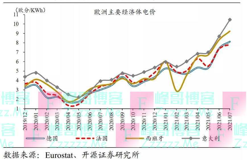 不仅如此,能源品价格的上涨,还大幅推升了欧美电力价格,进一步加剧能源危机冲击。作为欧美发电的“燃料”,天然气、动力煤、原油等价格的飙涨,大幅推升了欧美的发电成本。