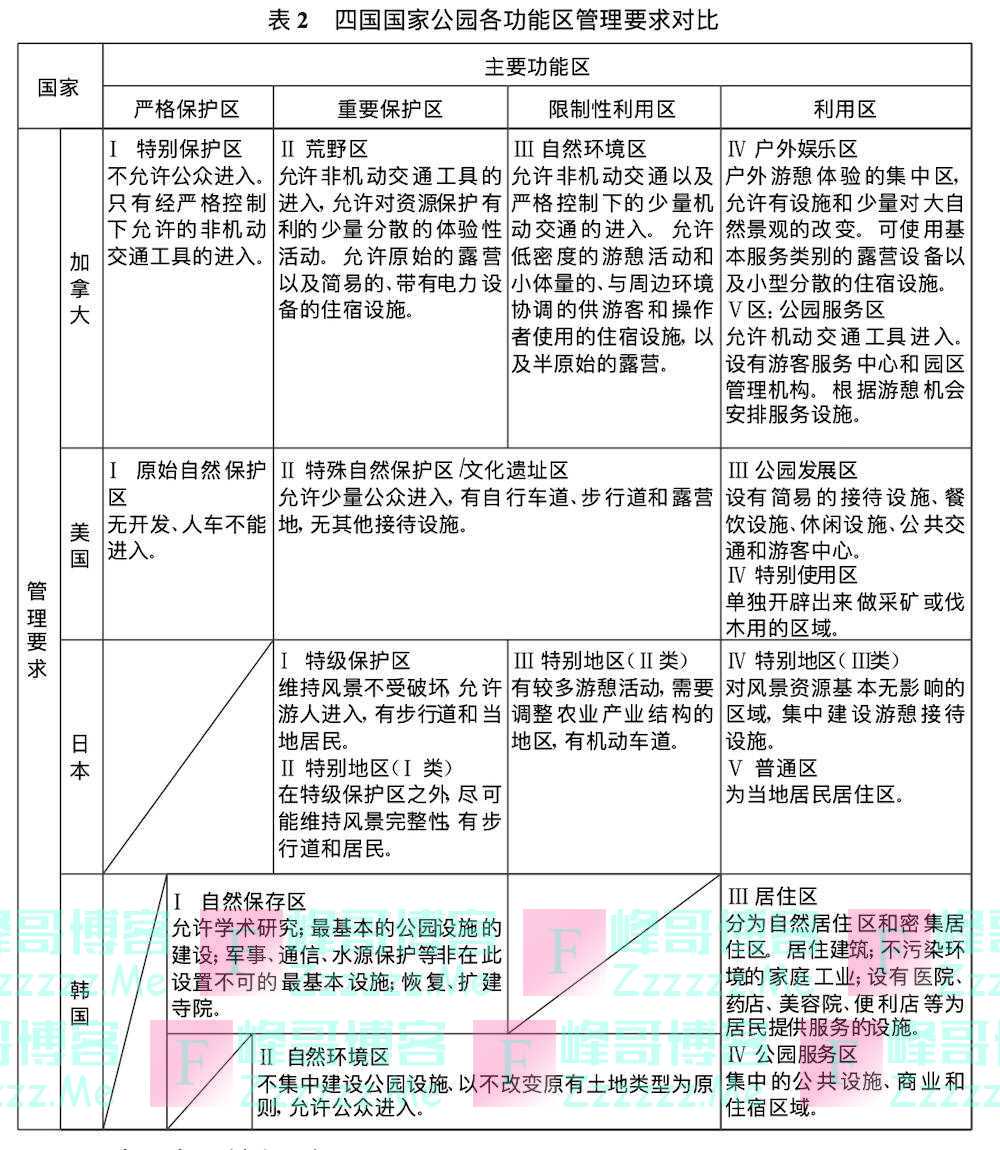 加拿大、美国、日本、韩国对国家公园功能区的划分和管理的标准。 表格来源:旅游学刊《国外自然保护地分区模式比较及启示》 作者黄丽玲、朱强、陈田 2007年3月关于我国国家公园内的功能区如何划分,李彬彬补充道:“现在国家公园的功能分区还没有公布,但在国家公园的概念里,确实包含了教育和游憩的功能,但一定不会出现像城市里那样的大规模基础设施建设,游客的访问也不会是传统的大众旅游模式,或许会以可持续的生态旅游为主。”推动《国家公园法》立法将是关键