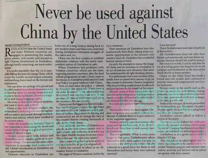津巴布韦《先驱报》刊登的评论文章《不作美国反华棋子》。新华社记者 张玉亮 摄