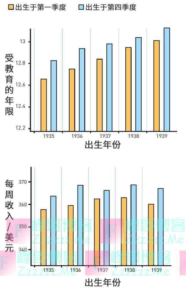 安格里斯特和因本斯在研究中利用了一个事实,即较早出生的学生可以比较晚出生的学生更早地合法离校。美国学生大都在秋季入学,在16-17岁开始离校工作,那么出生在每年1-3月的人,比出生在同年9-12月的人,平均少上了几个月的学。