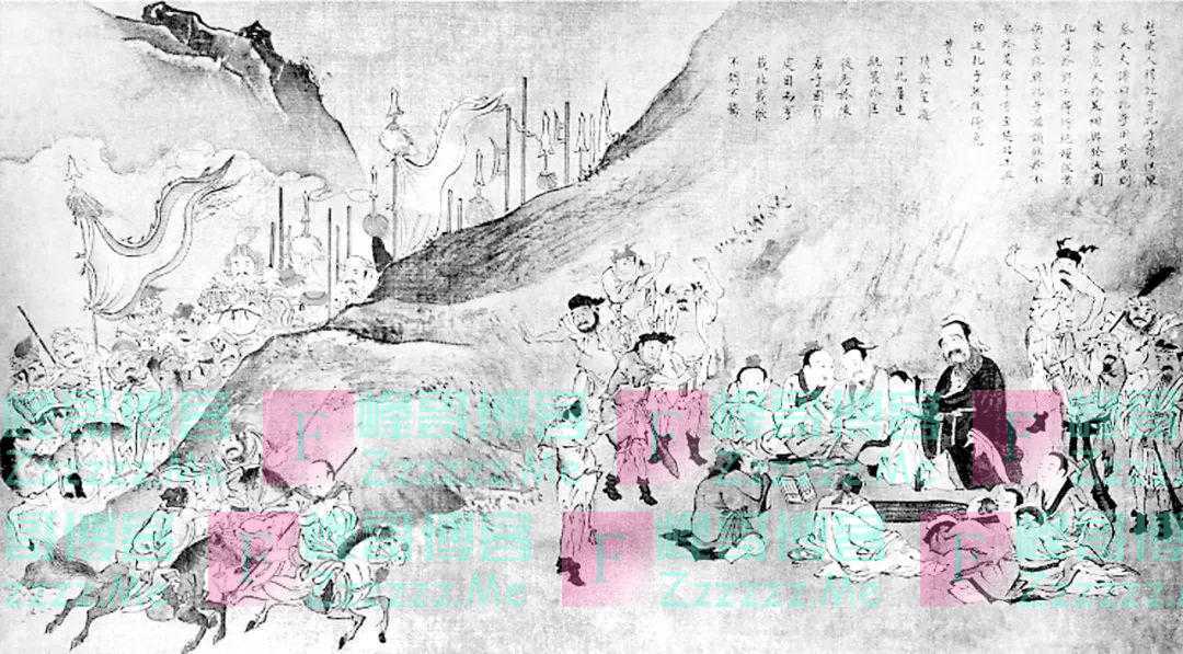 清代焦秉贞作《孔子圣迹图》之《在陈绝粮》。孔门师徒一行在陈国断绝了粮食,跟随的人都饿得爬不起来,孔子却依然讲诵诗书、抚琴歌咏。