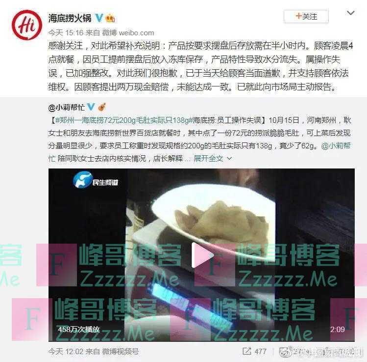 海底捞毛肚缺斤少两的事情被曝光后,很快引发热议。