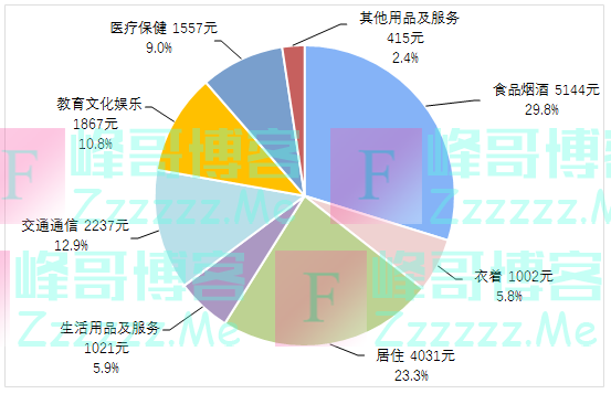 前三季度,全国居民人均食品烟酒消费支出5144元,增长13.2%,占人均消费支出的比重为29.8%;人均衣着消费支出1002元,增长18.2%,占人均消费支出的比重为5.8%;人均居住消费支出4031元,增长7.9%,占人均消费支出的比重为23.3%;人均生活用品及服务消费支出1021元,增长14.0%,占人均消费支出的比重为5.9%;人均交通通信消费支出2237元,增长14.4%,占人均消费支出的比重为12.9%;人均教育文化娱乐消费支出1867元,增长46.3%,占人均消费支出的比重为10.8%;人均医疗保健消费支出1557元,增长16.4%,占人均消费支出的比重为9.0%;人均其他用品及服务消费支出415元,增长26.3%,占人均消费支出的比重为2.4%。