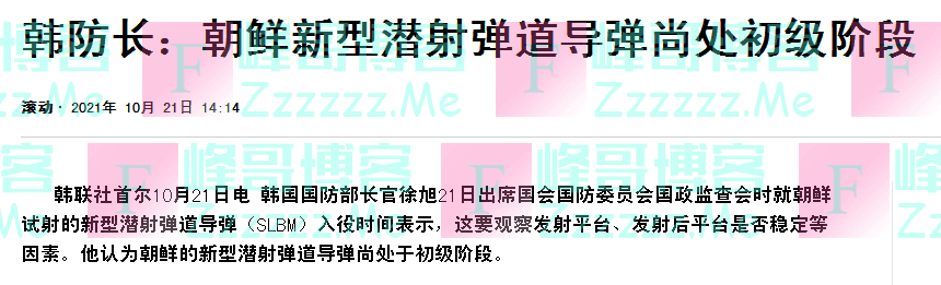 朝鲜20日成功试射新型潜射弹道导弹后,韩国外长郑义溶21日赶忙发表讲话称,韩国潜射弹道导弹性能远优于朝鲜,“望国民周知”。韩国防长徐旭则专门强调了一句话:“朝鲜潜射导弹还处于初级阶段”。