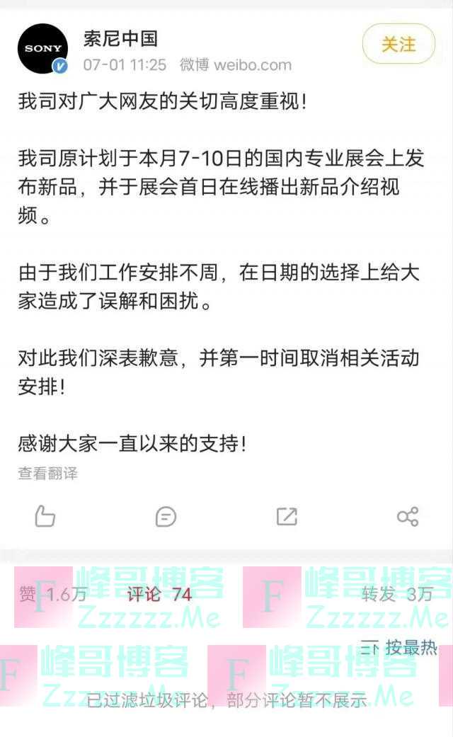 7月1日上午,索尼中国发布道歉微博,称由于工作安排不周,在日期选择上给公众造成误解和困扰。