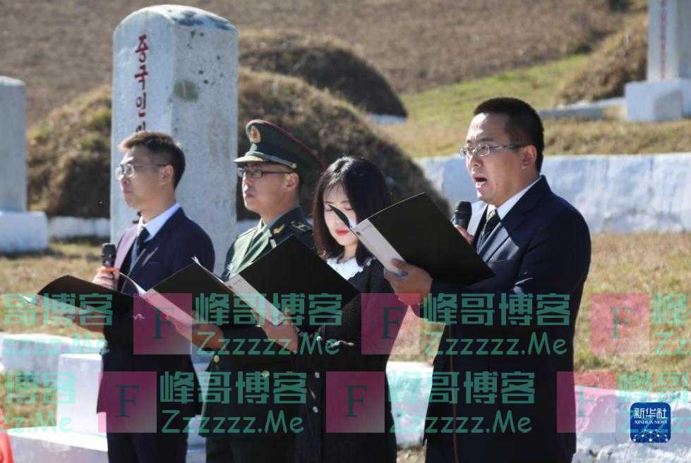 10月23日,在朝鲜咸镜南道西北部长津湖畔的长津邑中国人民志愿军烈士合葬墓地,中国驻朝鲜大使馆外交官代表朗诵献给长眠于此的志愿军英烈的祭文。新华社记者 江亚平 摄