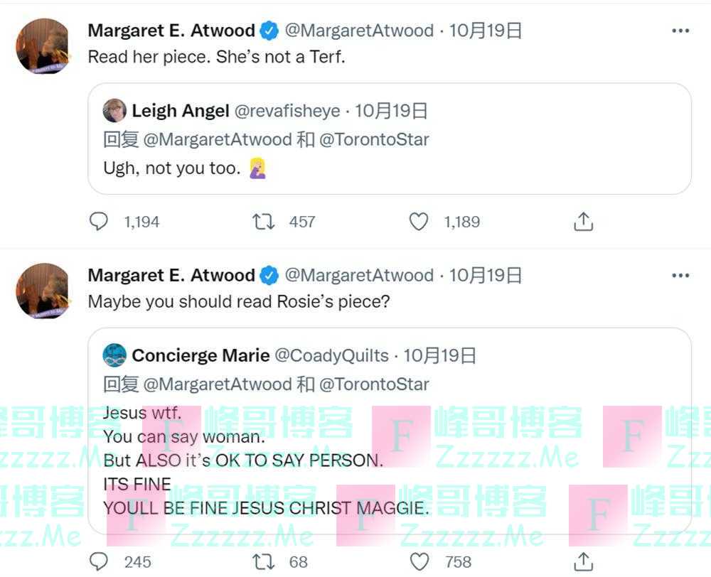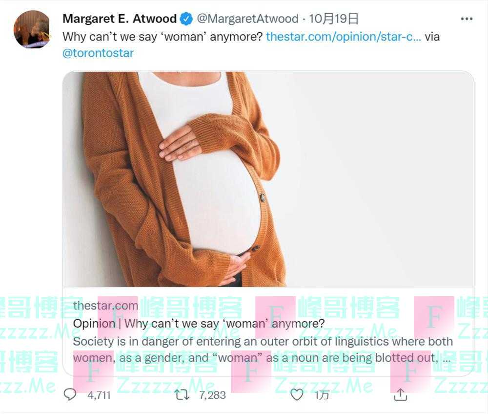 阿特伍德推特截图因为这条推特,一些社交媒体用户已经把她和《哈利·波特》的作者J·K·罗琳归为一类。许多人认为罗琳是一个TERF(排斥跨性别的激进女权主义者)。但其他人支持阿特伍德,包括平时不太可能赞同她的右翼捍卫者。阿特伍德推荐的这篇文章的作者是罗茜·迪曼诺(Rosie DiManno),文章于10月15日发表在《多伦多星报》上。文中写道:“‘女人’正面临成为脏字的危险……从官场词汇中被剔除,从医学词汇中被剔除,从谈话中被剔除。”她指责“语言的不恰当进化”和“跨性别激进主义的泛滥”,并列句了“女人”没有被用于其他术语的例子。迪曼诺认为,试图包容的行为——比如用“怀孕的人”而不是“女人”来表达对跨性别男性和非二元性别人士的尊重——实际上会把女性从对话中抹去。