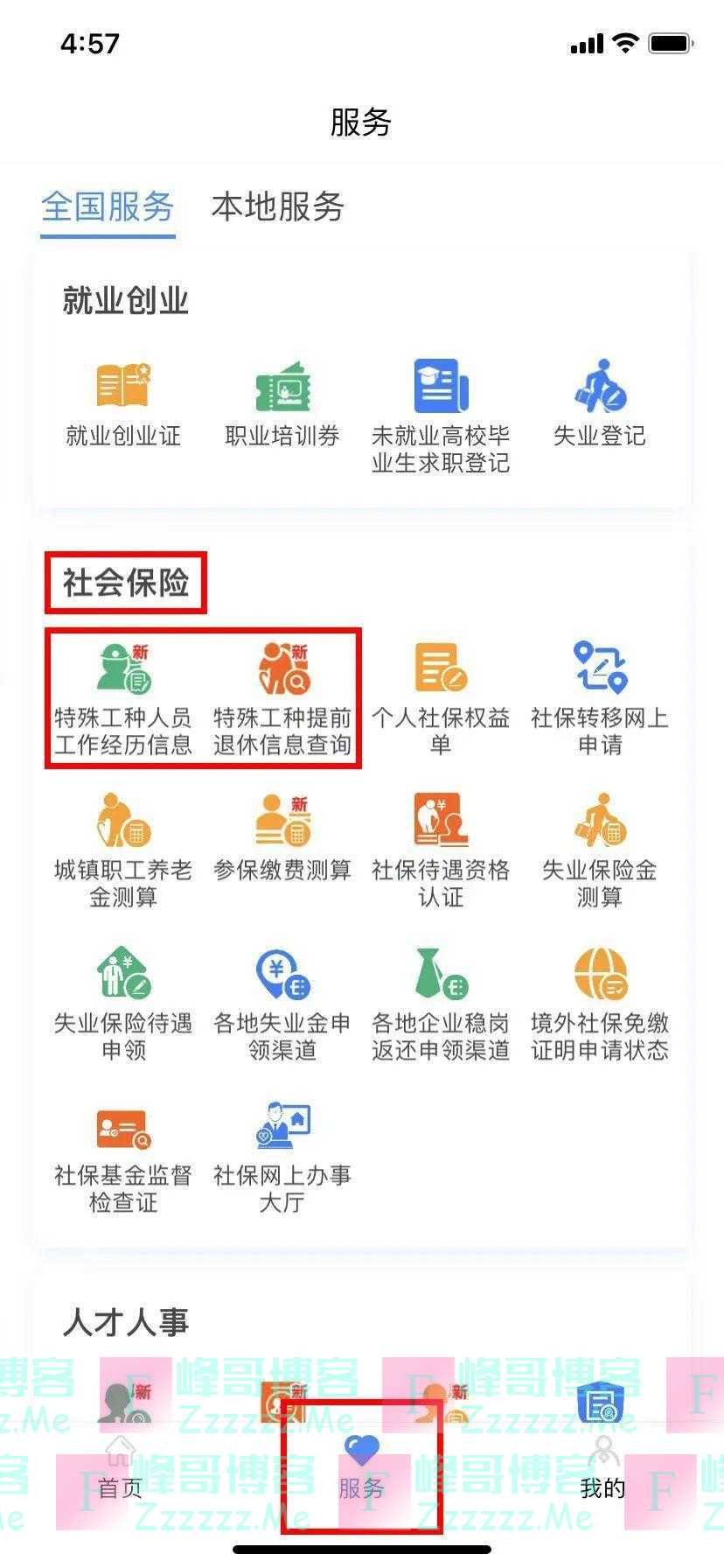 为保障特殊工种人员的权益,该类人群进入电子社保卡客户端“服务”-“社会保险”-“特殊工种人员工作经历信息”及“特殊工种提前退休信息查询”,可查询本人的工作经历及提前退休信息。