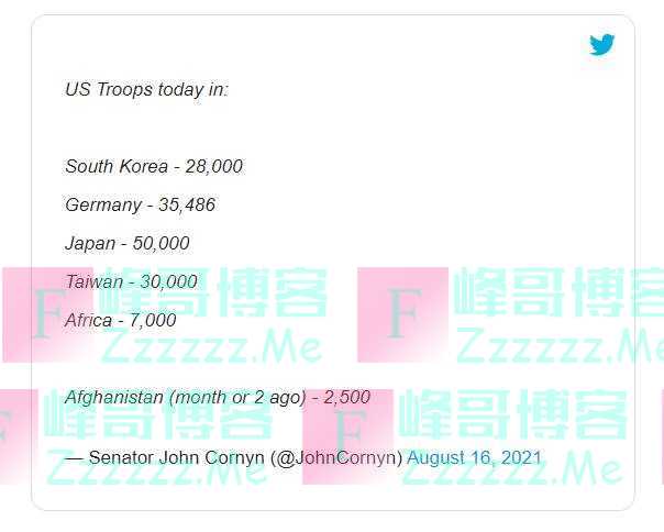 早在今年8月间,美国国会参议院共和党资深参议员约翰·科尼(John Cornyn)就曾在推特上公布所谓的美军在外驻扎的兵力,其中显示美军在台部署了多达3万人。