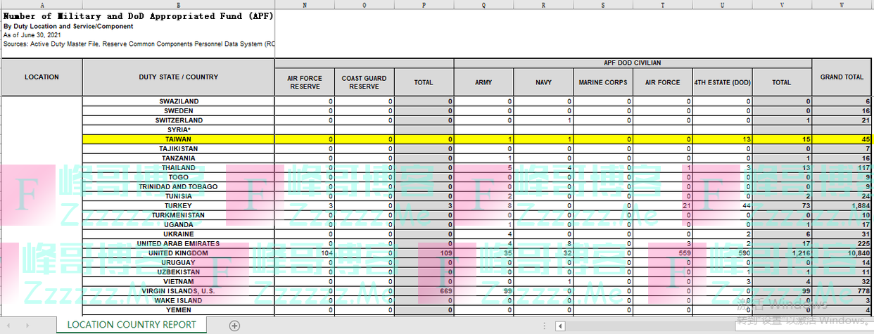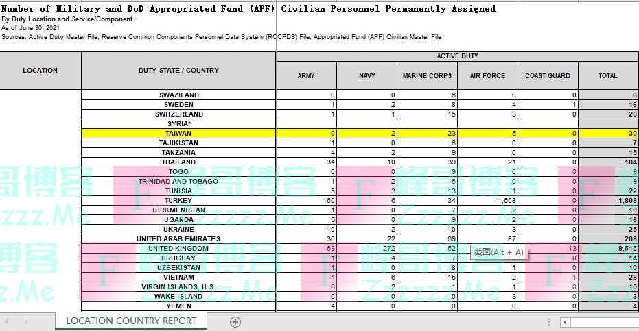 检索与美国国防部相关资料可以发现,其下属的人力数据资源中心(DMDC)存有关于美国国防部按国家/地区分列的军事和文职人员统计数据。