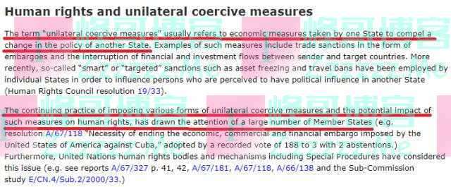△联合国人权理事会网站明确指出,单方面强制措施是指一国为迫使另一国改变政策而采取的经济措施,其造成的经济封锁以及对人权领域的影响已经引起了大量联合国会员国的警惕。