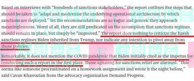 《美国展望》杂志以《拜登延续特朗普的毁灭性制裁》为题发文批评指出,这份报告既没有批评拜登从特朗普那里继承来的严酷制裁政策,也没有表明任何改变这些政策的意图。尤其值得注意的是,它完全没有提到疫情的因素。