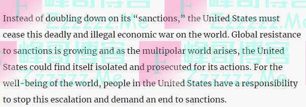 文章指出,任何对取消制裁的拖延都意味着更多的生命损失,特别是在疫情肆虐之际。停止制裁是一个减少危害的最低限度措施,它只要求美国“停止做坏事”。如果拜登不放弃这些残酷政策,就不可能从“永久战争”中翻开新的一页。