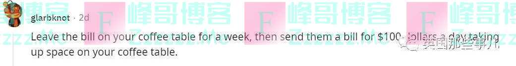 把账单放咖啡桌上一个礼拜,然后给他们寄一张每天收费100美元的账单,就说占用你咖啡桌上的空间了。