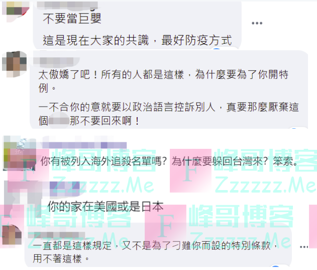 对于蔡丁贵这次抱怨回不了台湾,有岛内网友在蔡丁贵脸书文下方留言表示,“不要当巨婴,这是现在大家的共识,最好防疫方式”,“太傲娇了吧!所有的人都是这样,为什么要为了你开特例”,“你有被列入海外追杀名单吗?为什么要躲回台湾来?”“你的家在美国或是日本”。也有网友反映自己家人同样订不到防疫旅馆,今年没法回台湾过年。↓