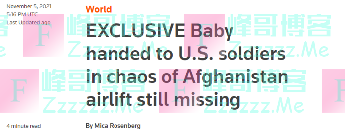 读者留言“澎湃明查”搜索发现,这一说法源自11月5日路透社发布的独家消息,称在美军撤离阿富汗的混乱中,有一名两月大的婴儿被其父母交给美国士兵后,至今不知所终。
